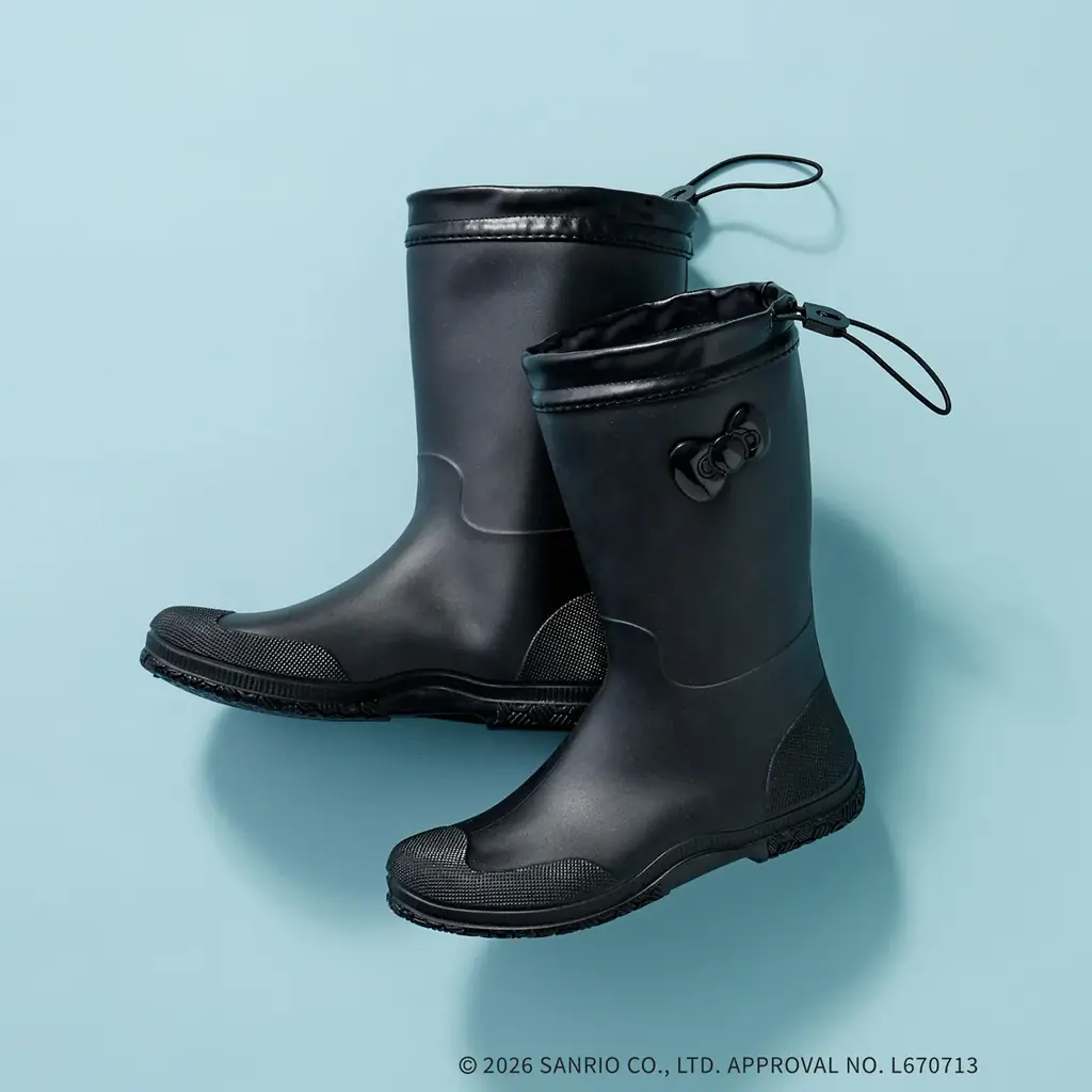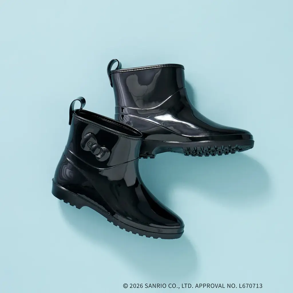 ブーツはロング丈・ショート丈の2タイプを用意。いずれもサイドにハローキティのリボンパッチを配し、パッチはあえてブラックで統一することで大人っぽさを演出しています。ロング丈のポケッタブル仕様のブーツは6,600円(税込)、ショート丈は5,980円(税込)です。型番の情報として同型ショート丈は(C71-95012)、同型ロング丈は(C71-95011)も用意されています。
