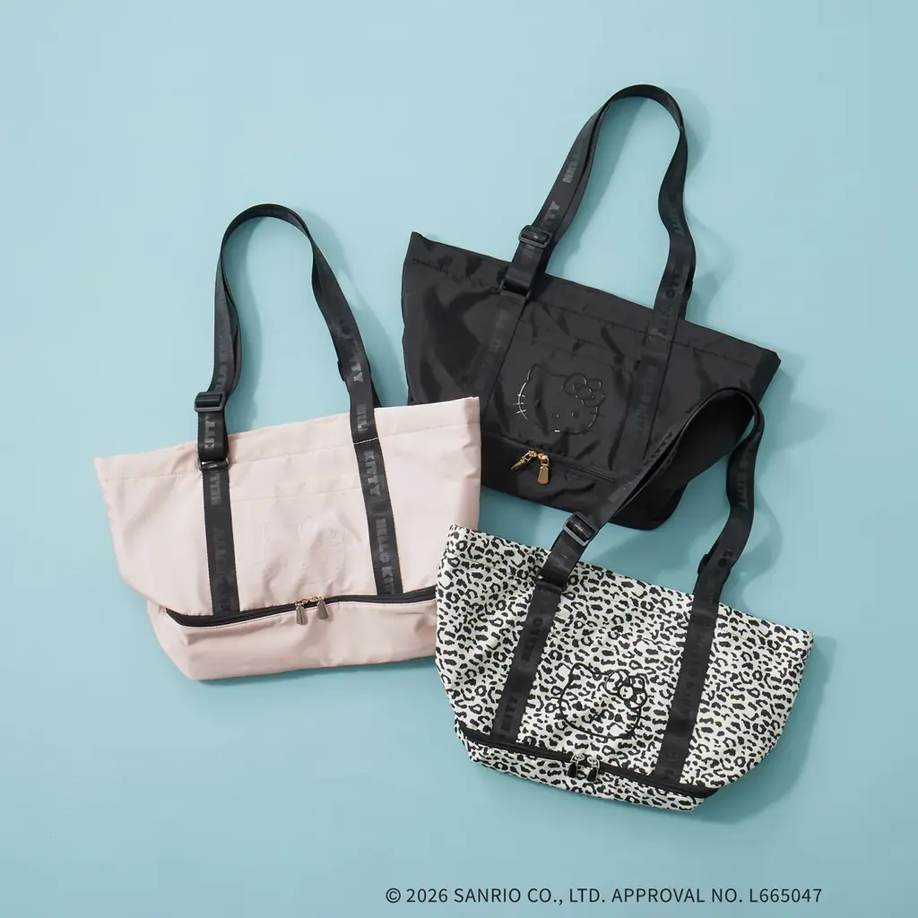 今回のコラボでは保冷機能を備えたアイテムや日常で使いやすいポーチ類も展開されます。いずれもハローキティの立体フェイスプリントを取り入れ、モノトーンやレオパード柄で大人の雰囲気を残しています。