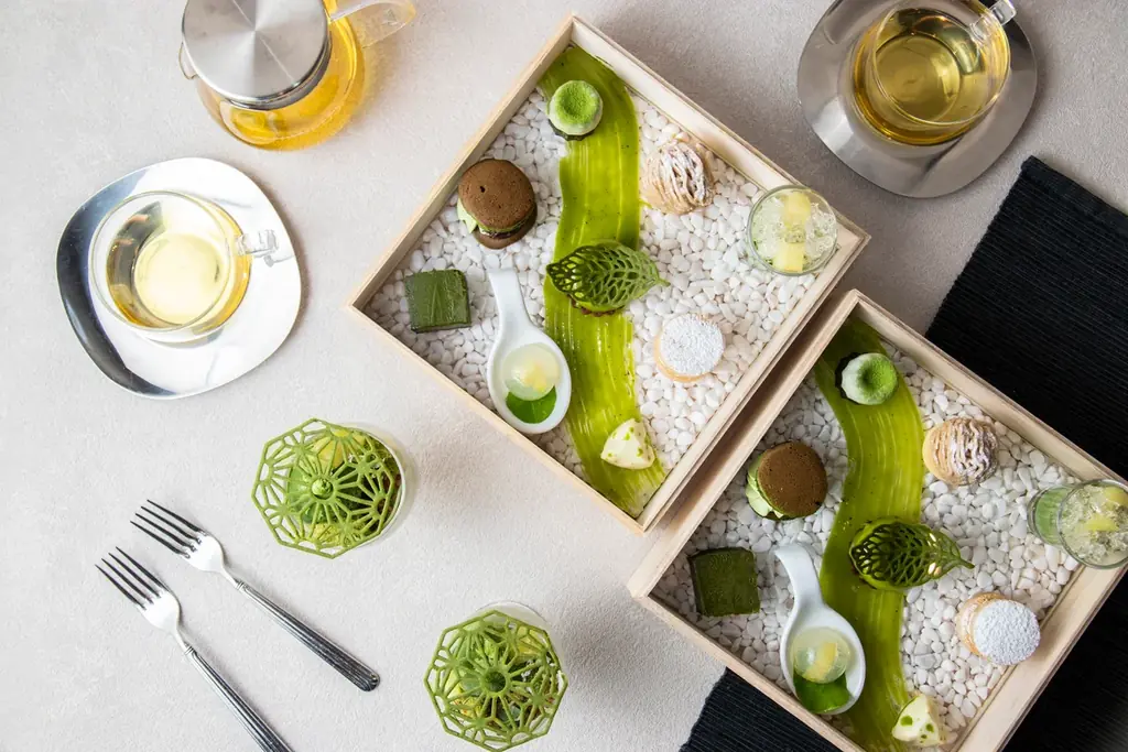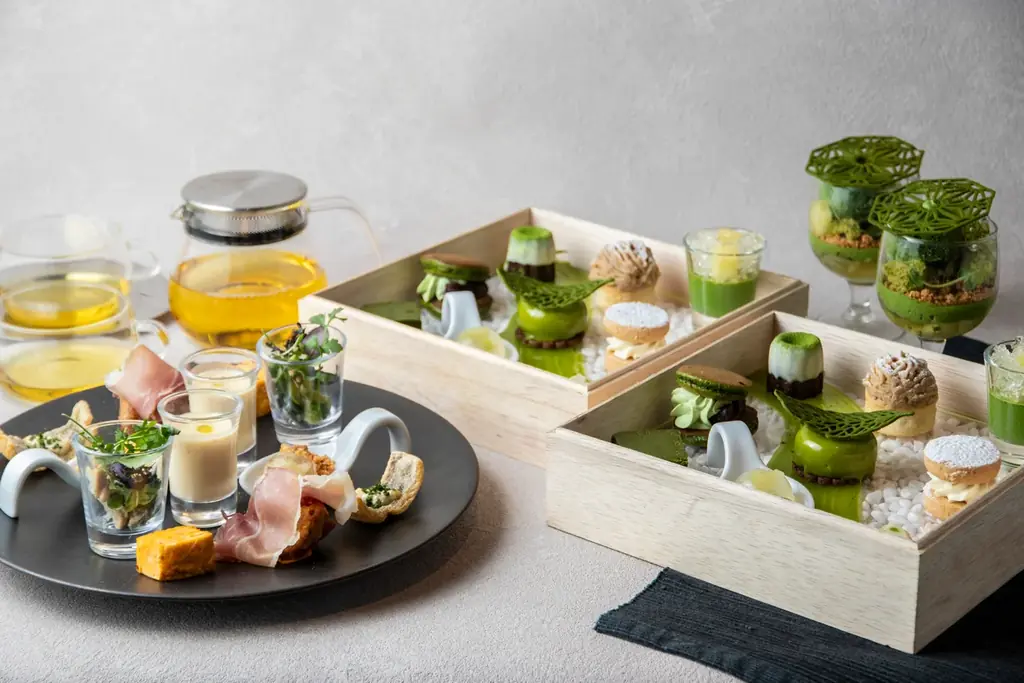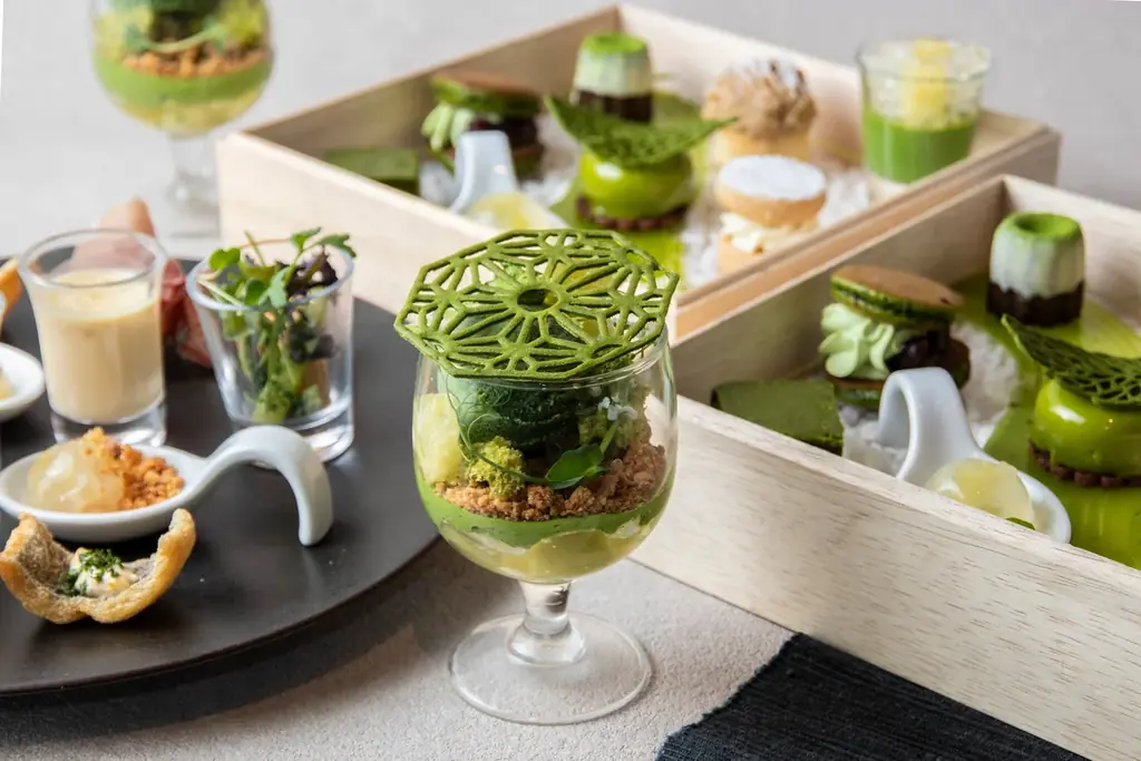 | 主なスイーツ | 抹茶とメロンの苔テラリウムパフェ、抹茶の濃厚テリーヌショコラ、抹茶とピスタチオのムースケーキ、抹茶のミニどら焼き、柚子香る抹茶のボンボンショコラ、抹茶のカヌレ、和栗のモンブランタルト、ごまのサブレサンド(玄米茶クリーム)、抹茶とメロンのヴェリーヌ、メロンと抹茶の水饅頭 |