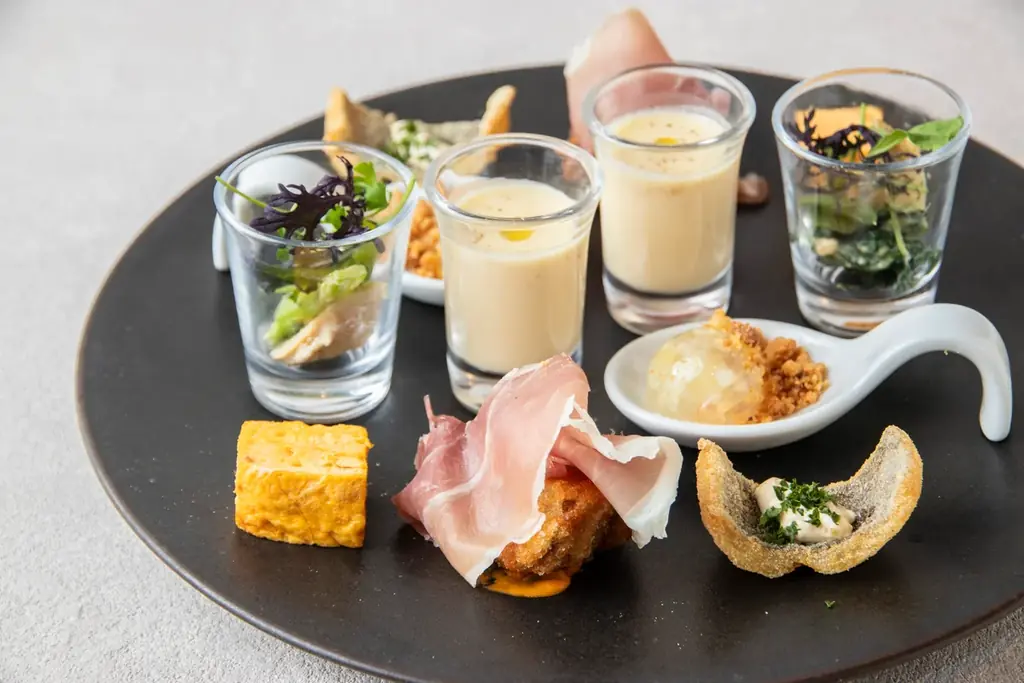 | セイボリー | とうもろこしのポタージュ、ハモのセモリナフリット、トリュフ風味のだし巻き玉子、ヤングコーンのゼリー寄せ、生ハムとポテトのビアバッター、つぶ貝のヴィネグレット和え |