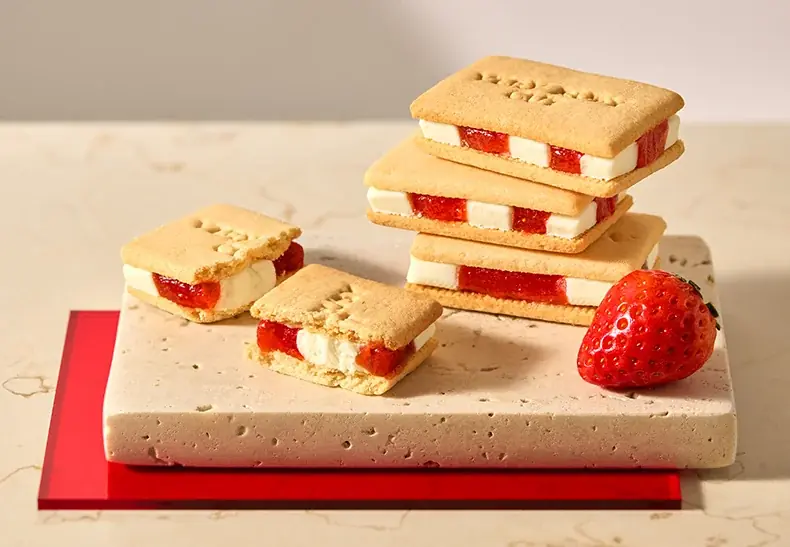 いちごミルクサンドは累計450万個の販売実績を持つ看板商品です。使用する苺は真っ赤な果肉と香り高い甘さが特徴のイタリア産サブリナ苺のコンフィチュール。そこに練乳ミルクのコクを練り上げたホワイトショコラを合わせ、とろけるダブルメルト製法で仕上げます。柔らかな状態で合わさった素材をしっとりしたクッキーでサンドした構成です。
