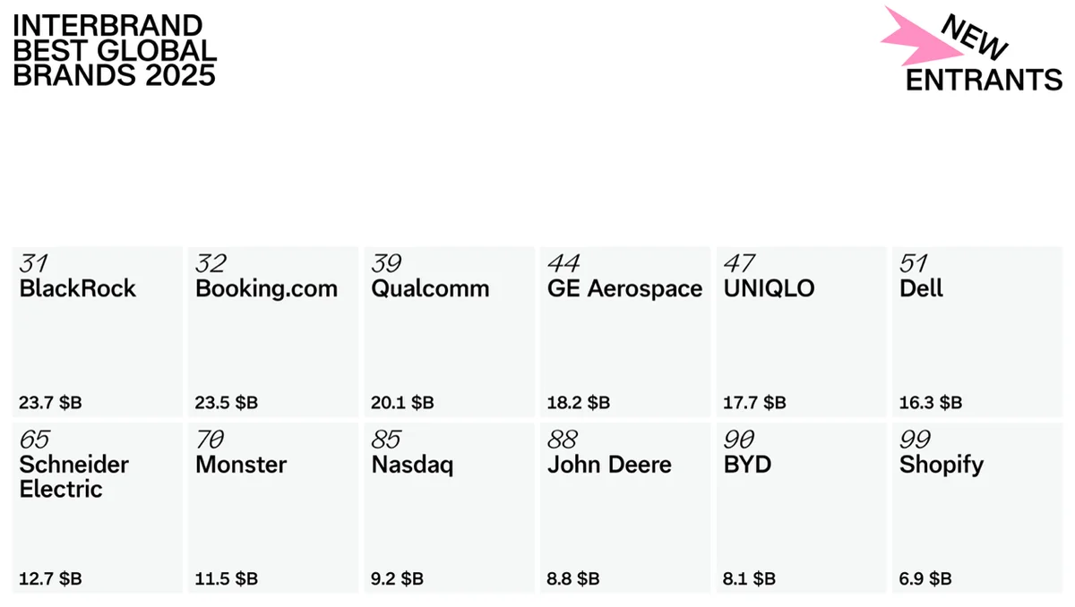| 新規ランクイン(主なもの) | BlackRock(31)、Booking.com(32)、Qualcomm(39)、GE Aerospace(44)、UNIQLO(47)、Schneider Electric(65)、Monster(70)、Nasdaq(85)、BYD(90)、Shopify(99) |