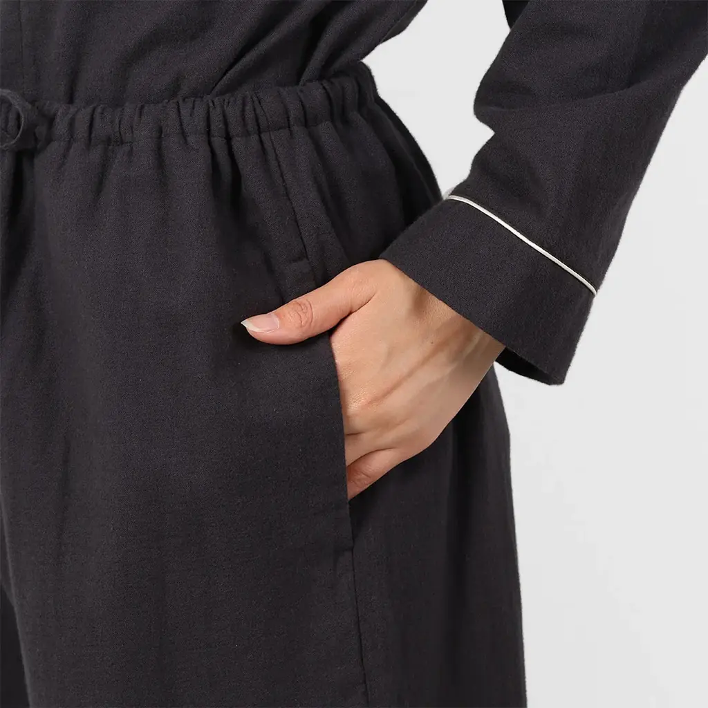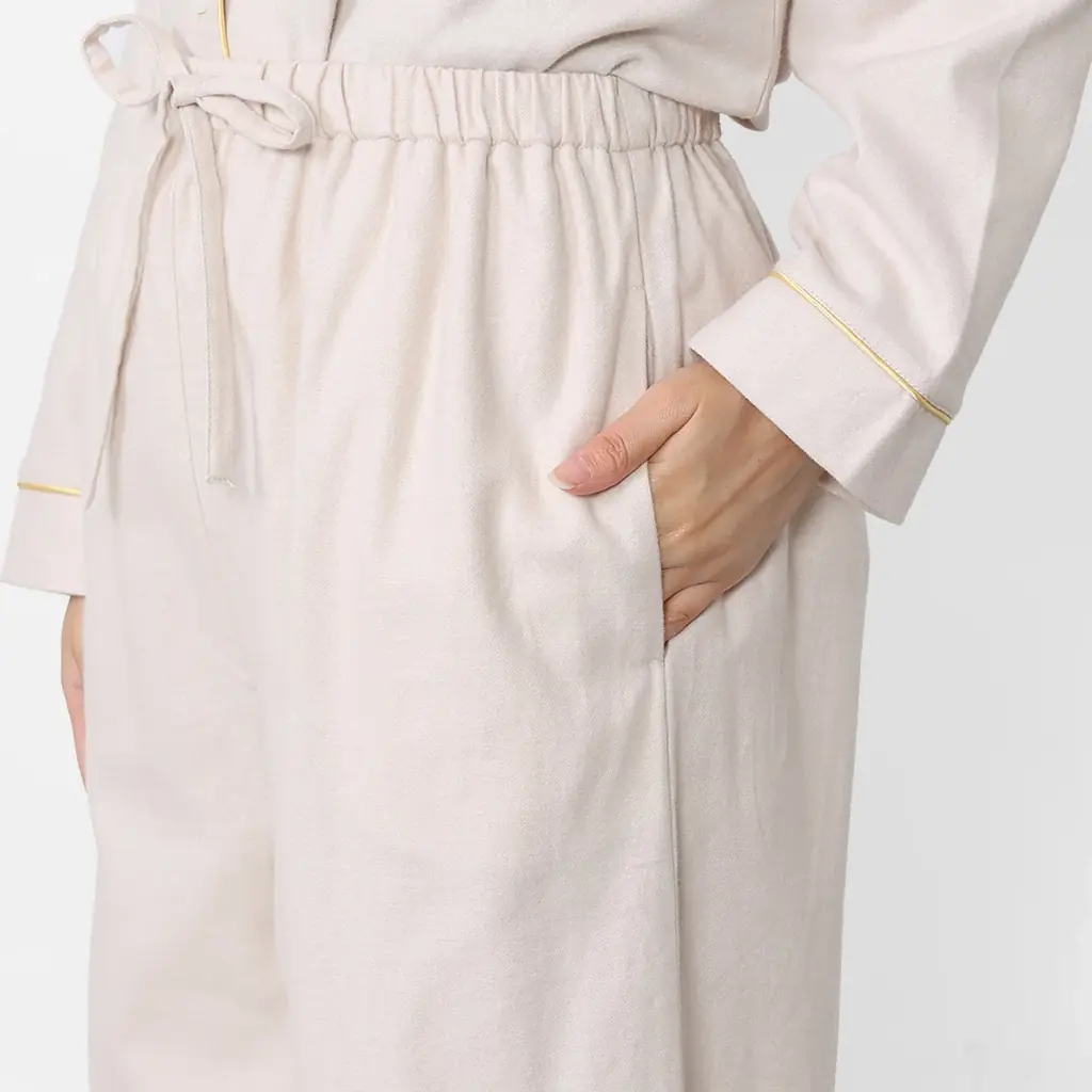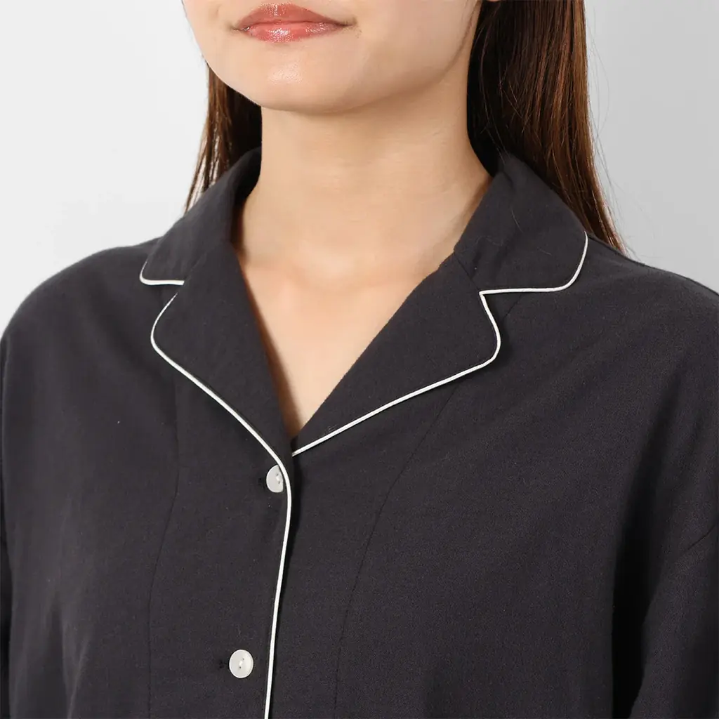 起毛フランネルにストレッチを加えたパジャマセットアップ。綿95%・ポリウレタン5%の素材構成で肌触りはふんわり柔らかく、優れた吸湿性で寒い夜も快適な睡眠をサポートします。耐久性も見込めるため毎日の使用に適しています。トリミング配色がアクセントになっています。