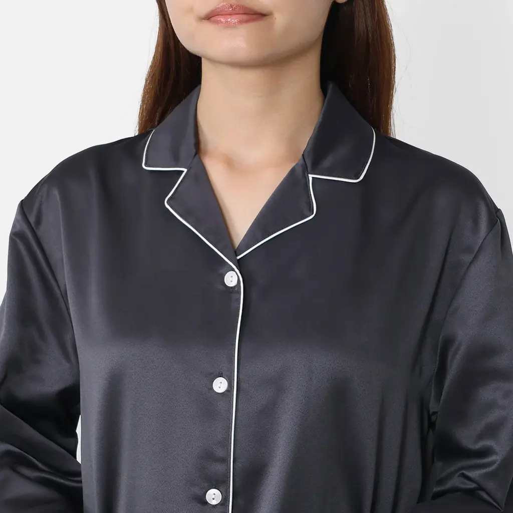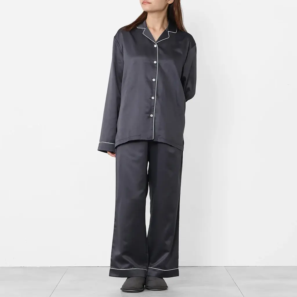 上品な光沢を持つサテン生地の長袖トップスとロングパンツのセット。肌に触れる裏側は綿素材で、インナー無しでも冷たさを感じにくい仕様になっています。汗を吸う性質があり蒸れにくく、シルクのような滑らかな表面と綿の快適性を組み合わせたナイトウェアです。