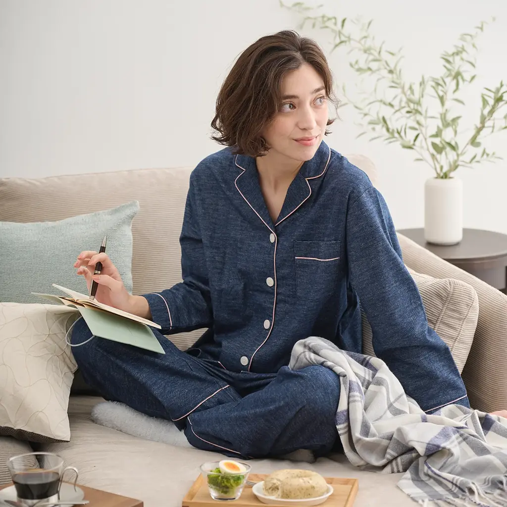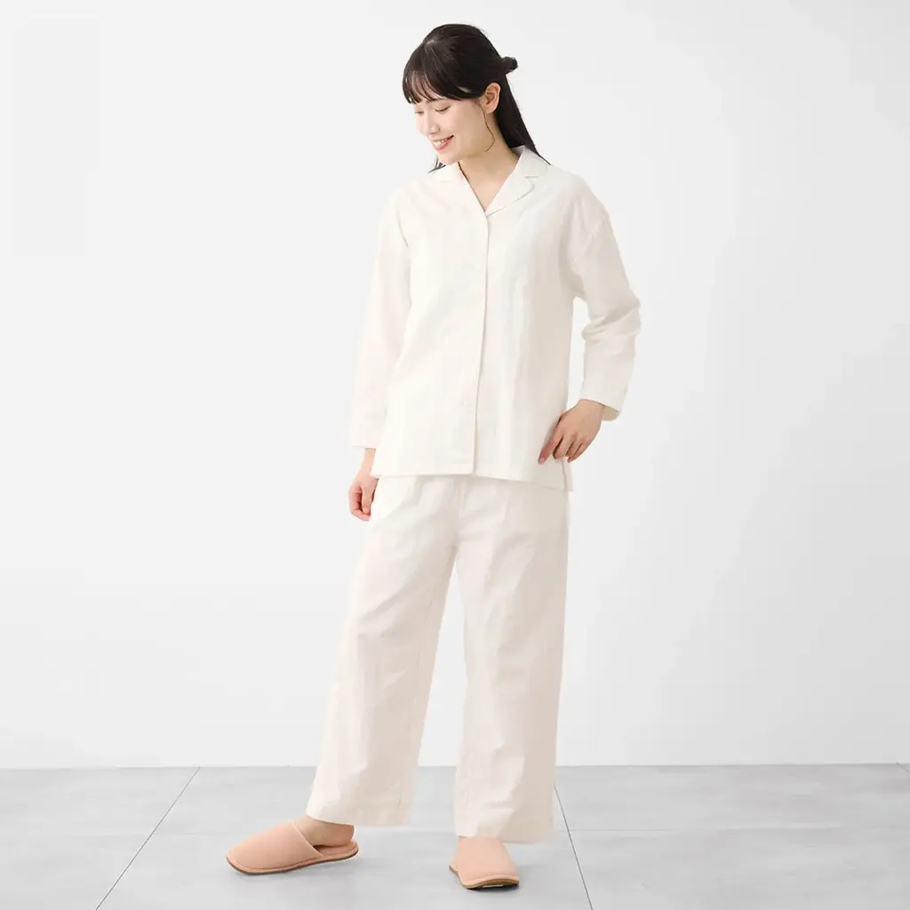 綿100%の二重(W)ガーゼを起毛加工した、ふんわり軽いセットアップ。優しい肌触りと優れた吸水性を備え、睡眠中の快適性を重視した仕様です。起毛により保温性があり、上品な配色パイピングをアクセントにしたシンプルで幅広い年代に合うデザインです。