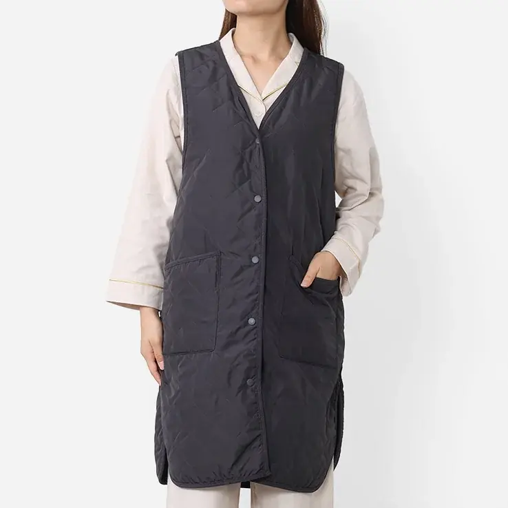 中綿にTHERMOLITE®を使用し、軽い着心地が特徴のロングベスト。撥水加工が施されており、エプロン代わりの使用やゴミ出し、ペットの散歩、ルームウェアの上から羽織る用途に適しています。着丈が長くお尻を覆うデザインにより保温性も確保されています。