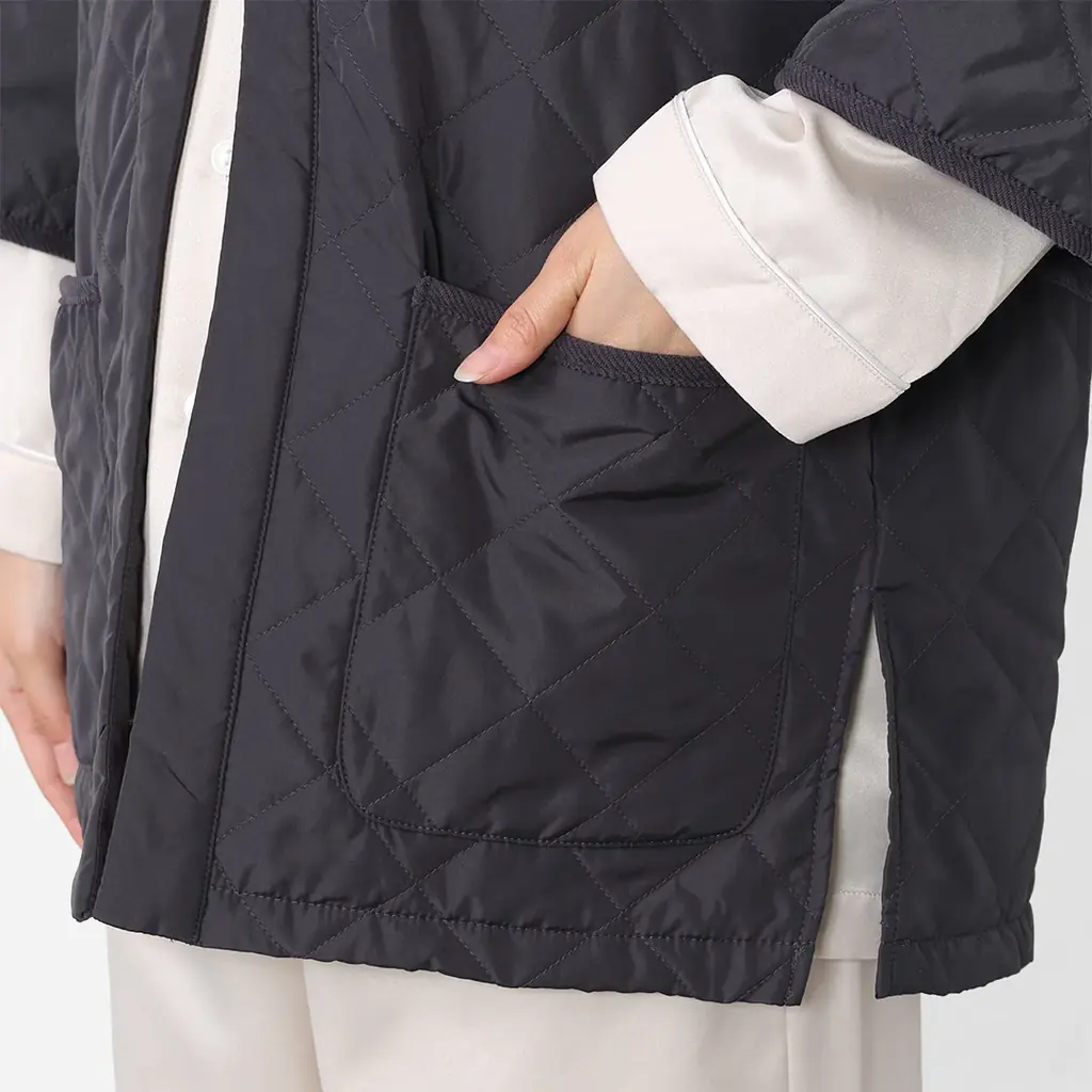 中綿にTHERMOLITE®を用いた半纏(はんてん)スタイルのトップスです。お尻が隠れる丈で暖かく、撥水加工付き、短めの袖で家事動作がしやすい設計。機能性とスタイリッシュさを両立したデザインで、屋内外のちょっとした用事にも使いやすい仕様です。