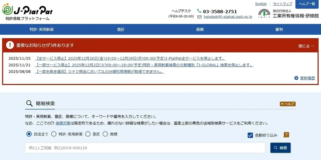 2025年12月17日(水)15:00、独立行政法人工業所有権情報・研修館(INPIT)は、令和7年(2025年)1月から11月までの期間における特許情報プラットフォーム「J-PlatPat」へのアクセス状況をまとめ、公表しました。本年は昨年に続く年間集計の公表に加え、意匠・商標分野のアクセス実績を初めてランキングに含めています。