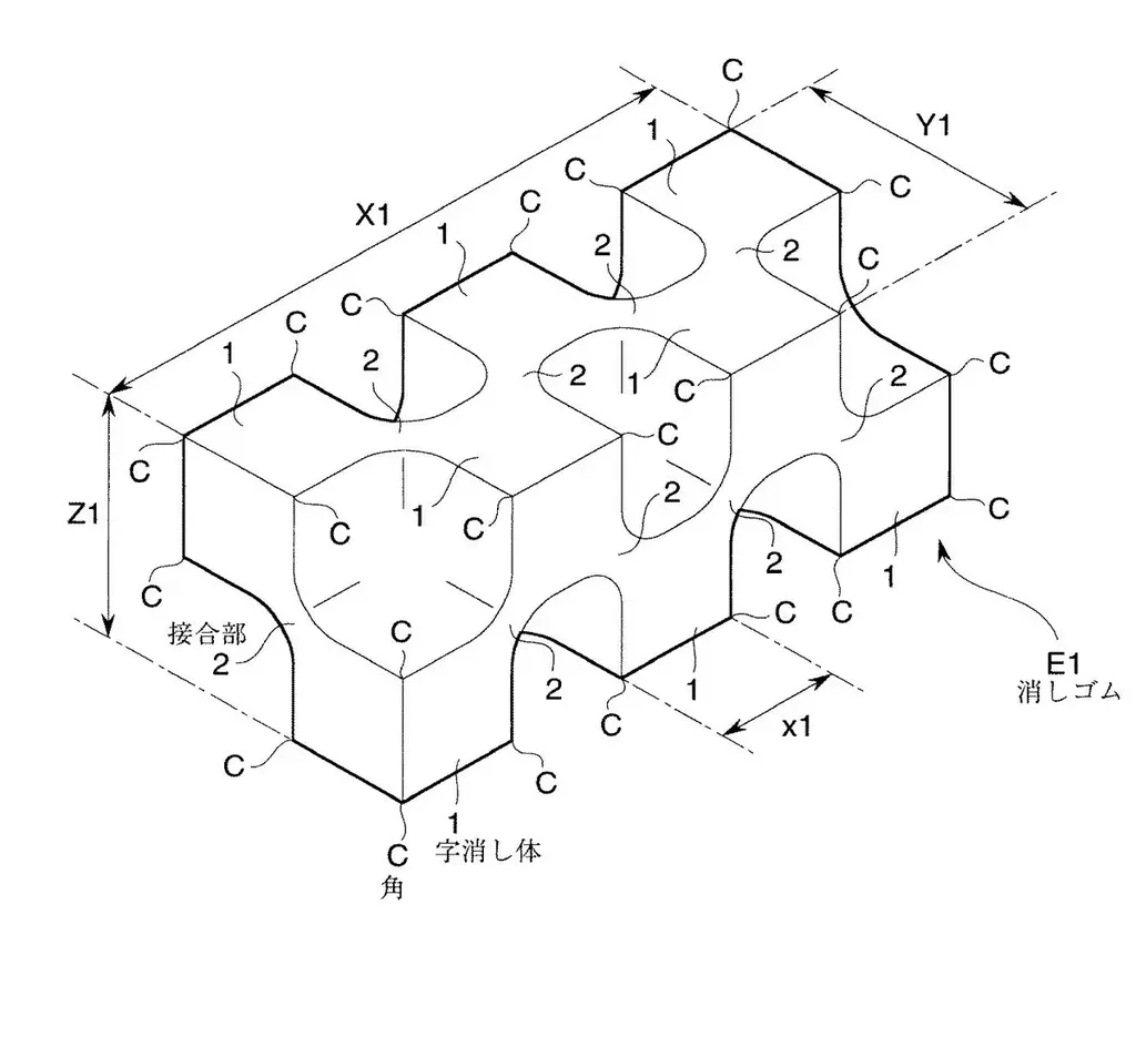 出典:特許第4304926号公報。カドケシ®は10個のキューブを接続した構成をもち、角(「カド」)が合計28個存在するデザインになっています。製品名「カドケシ®」は商標権としても取得されており、意匠登録もなされています。