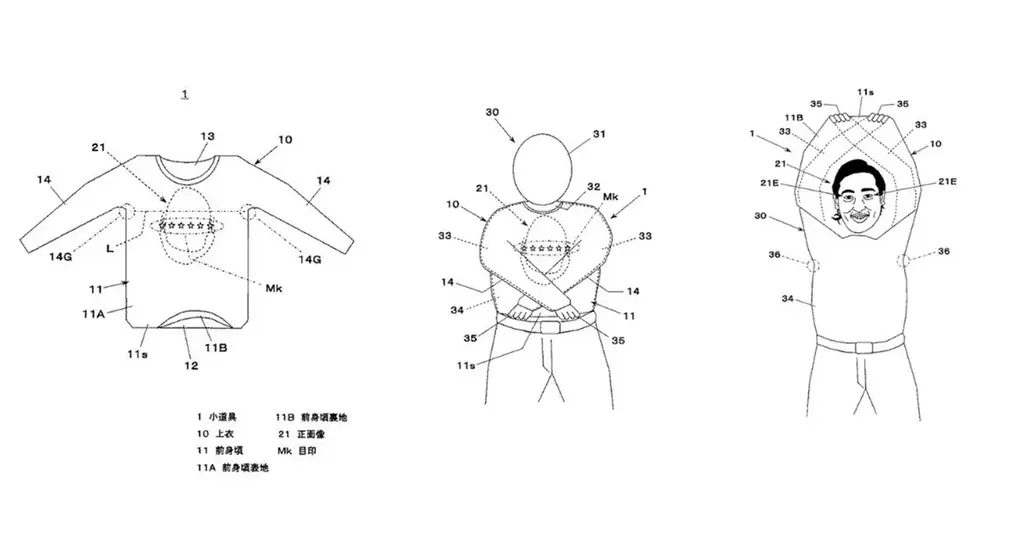 出典:特許第6366202号公報。5位にランクインした株式会社SUPER MARKITの「小道具」は、いわゆるロバート秋山氏が用いる体モノマネTシャツで知られる発明です。シャツの表面に、自分の目と顔の輪郭と同じ位置に目印を配置することで、着用者が素早く別人の顔に見えるようになるという発想が特長です。