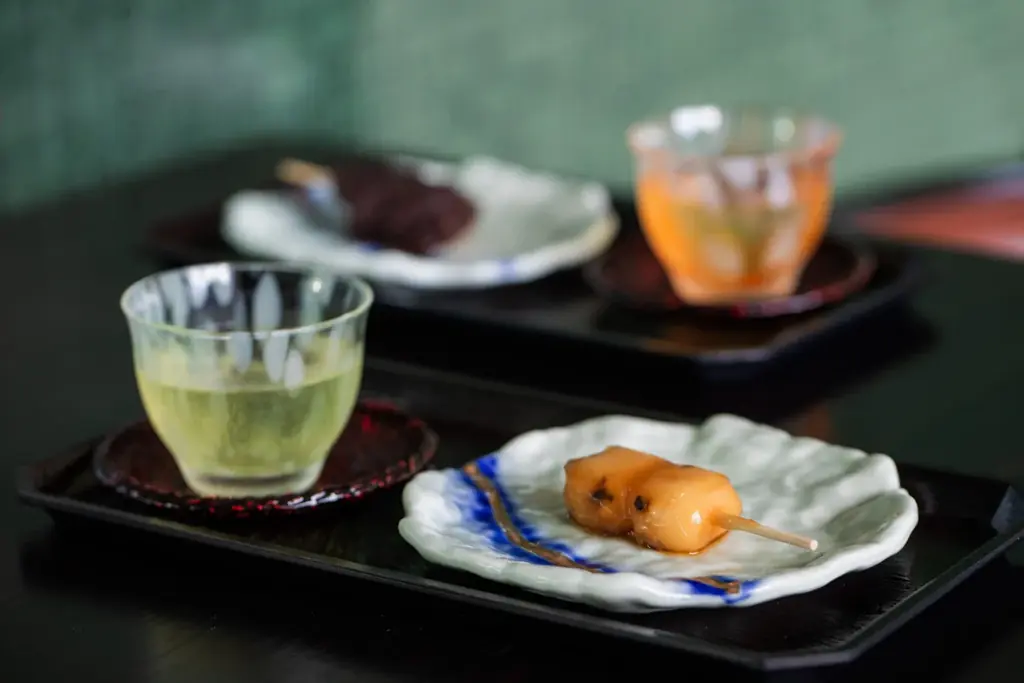 到着時のおもてなしとして、サロンにて地元の老舗和菓子店「銀月」のお団子を提供する旨が明記されています。到着直後に一息つけるよう配慮したおもてなしです。