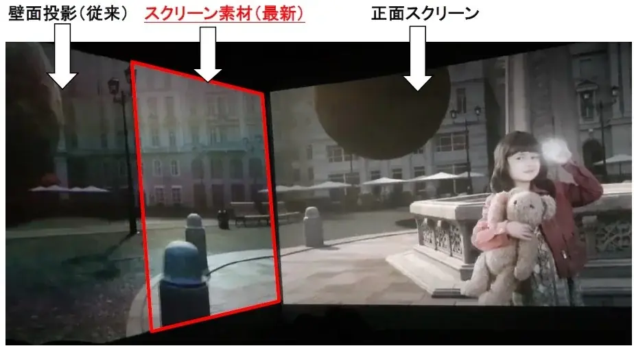 | SREENX 最新スペックの主な改良 | 左右壁面に正面と同等のスクリーン施工、左右投影プロジェクターのスペックアップ、映像の明るさと一体感の向上(プレミアムラージフォーマット) |