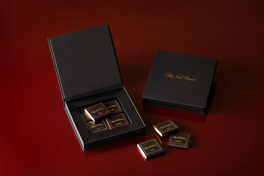 - ニューオータニ キャレショコラ 8枚入り(各2枚ずつ) ¥3,240 — ダーク、ミルク、ホワイト、キャラメルの4種を各2枚ずつ詰め合わせたギフト向けのカレ(正方形)ショコラ。感謝の気持ちを伝える贈り物に適した設えとされています。