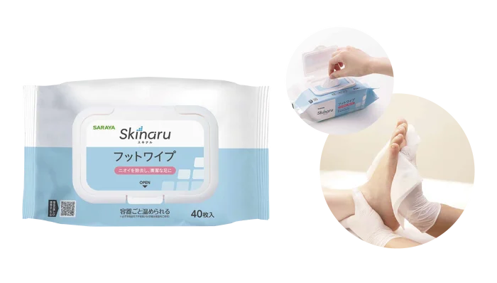 プレゼントされる製品は「スキナル フットワイプ(40枚入)」です。製品は入浴や洗浄の機会が限られる現場において、短時間で足の清潔保持とスキンケアを行えるよう設計されています。準備や片付けの負担を抑えることで、日常業務の効率化にも寄与します。