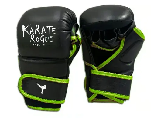 - 特製ロゴ入りMMAグローブ:TWINS JAPAN製のオリジナルデザイン(緑のライン、KARATE ROGUEロゴ入り)。