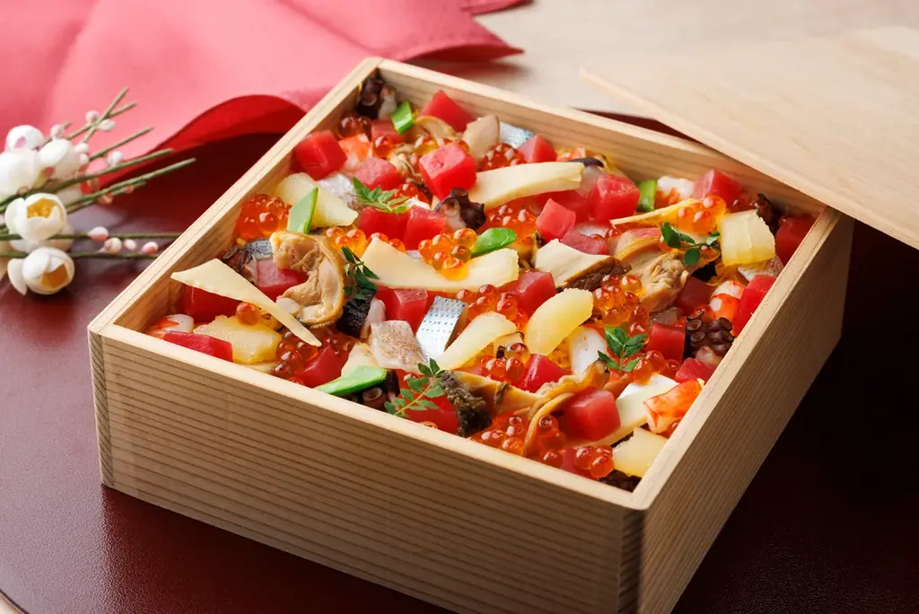シェラトン都ホテル東京が提供する「鮨 白金 さえ㐂のちらし寿司」は、2026年2月2日から3月2日まで予約を受け付ける、数量限定のお持ち帰り商品です。天然本鮪をはじめ、鮑、車海老、いくら、煮蛤、鯛、小肌、数の子、蛸など、職人が厳選した海の幸を贅沢に盛り込み、折箱に詰めて用意されます。