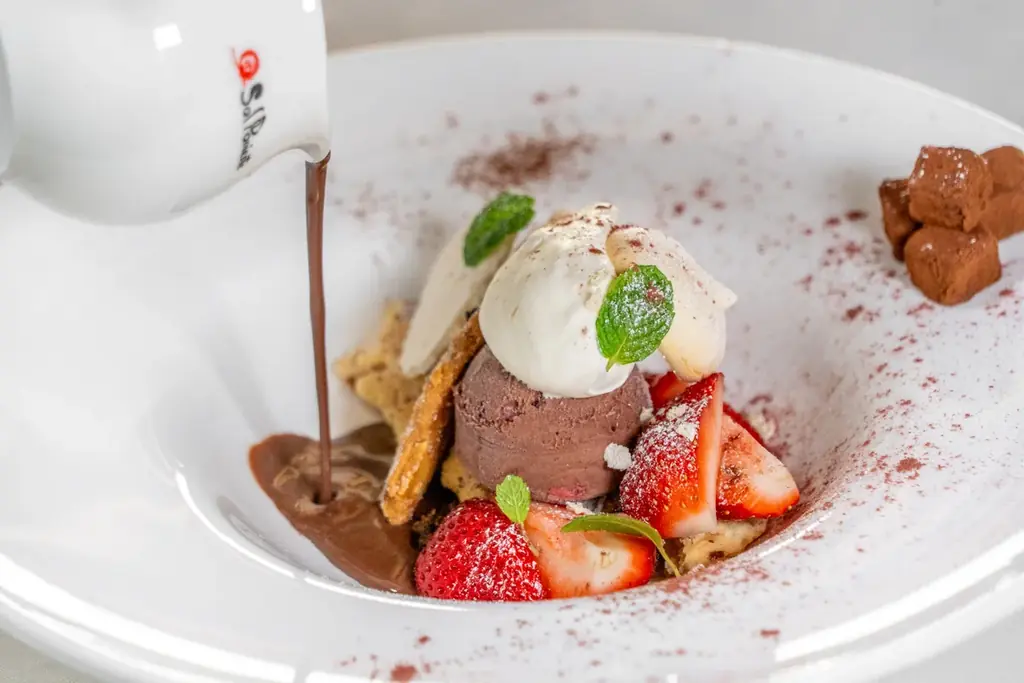 - チョコレート・赤ワイン・ベリーの自家製アイス+ナッツタルト。目の前でソースをかける演出。