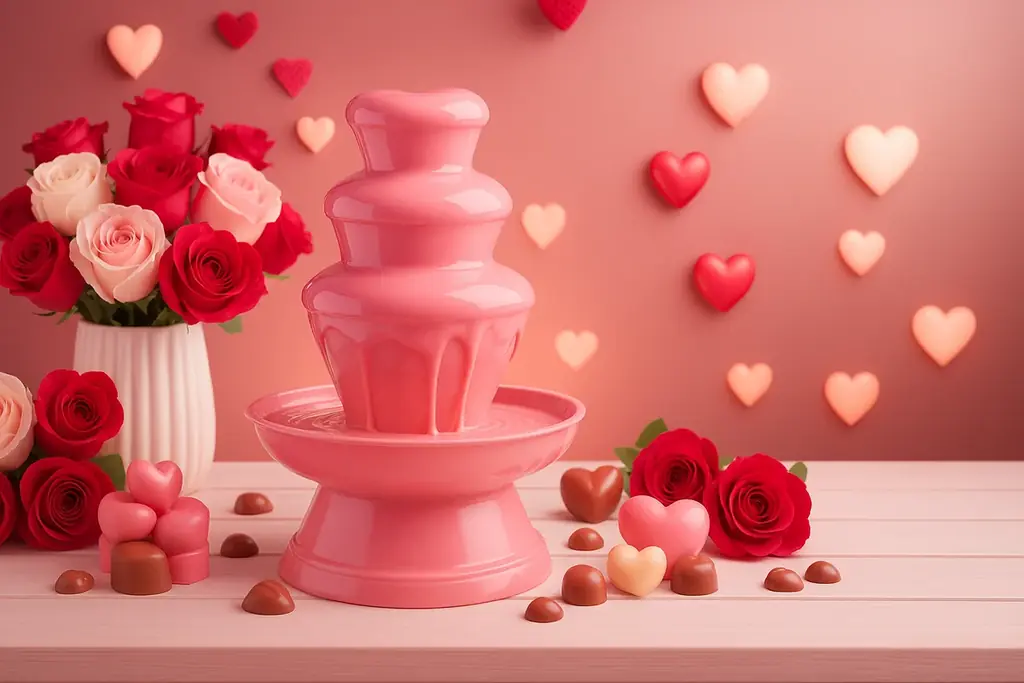 視覚と味わいのひととき — ピンクのチョコレートファウンテン(バレンタイン期間)