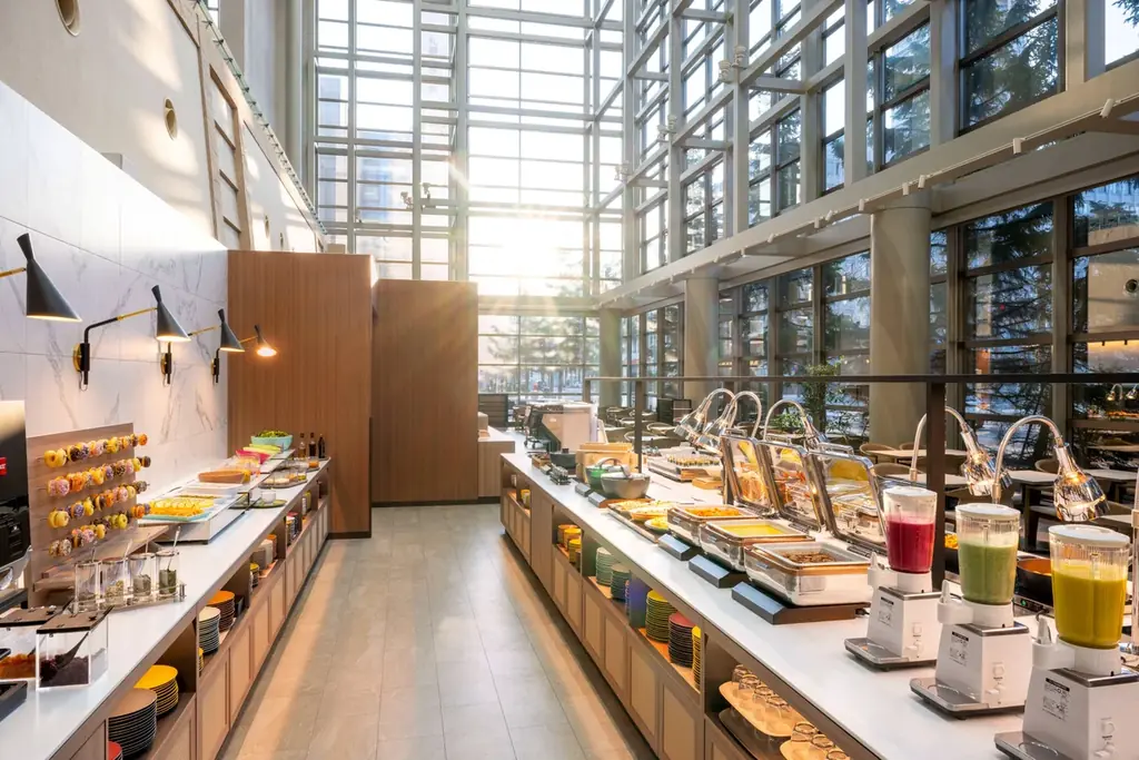 バレンタイン期間中はラウンジにピンクのチョコレートファウンテンが登場し、見た目の華やかさと味わいの両面で滞在に彩りを加えます。北海道産小豆のミニ大福、マシュマロ、ミニカステラなどをチョコレートにくぐらせて楽しめる構成です。